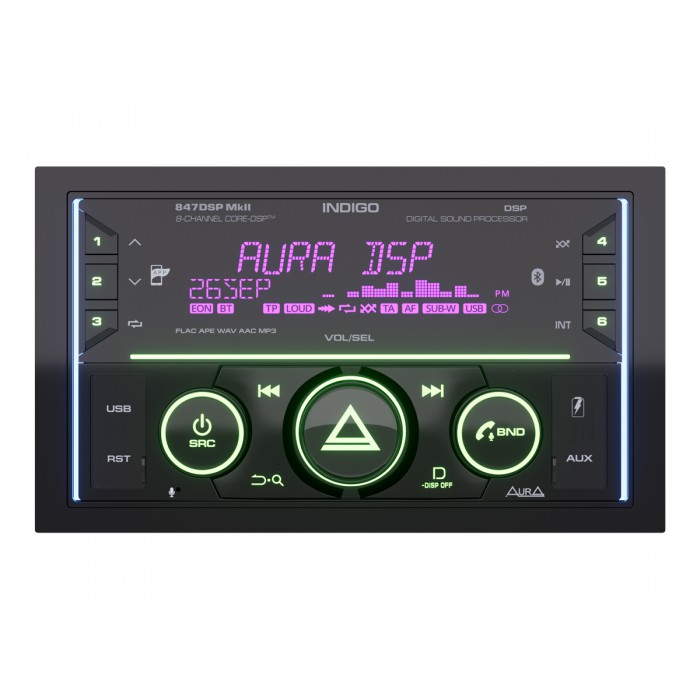 (4х51Вт) 2 DIN автомобильный 8-канальный процессорный BT/USB/FM ресивер Aura INDIGO-847DSP Mkll.